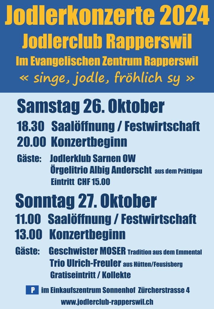 Ende Oktober fanden im Evangelischen Zentrum Rapperswil unsere Herbstkonzerte statt. Unter dem Motto "singe, jodle, fröhlich sy" sangen und spielten nebst dem Jodlerclub Rapperswil, der Jodlerklub Sarnen, das Örgelitrio Albig Anderscht, sowie die Geschwister Moser und das Trio Ulrich - Freuler