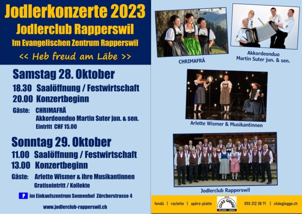 Ende Oktober fanden im Evangelischen Zentrum Rapperswil unsere Herbstkonzerte statt. Unter dem Motto "heb freud am Läbe" sangen und spielten nebst dem Jodlerclub Rapperswil, das Jodelterzett CHRIMAFRÄ, Akkordeonduo Martin Suter Junior und Senior, sowie Arlette Wismer mit ihren Musikantinnen Doris und Léonie